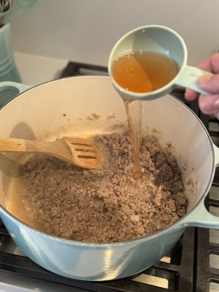 - Increase the heat to medium. Add a splash of wine before adding the ground beef. Break up the meat but do not brown it.