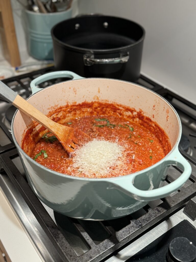 - Let it simmer for 1.5 hours, adding 1/4 cup of grated parmesan cheese at the end of cooking after you take out the parmesan heel.