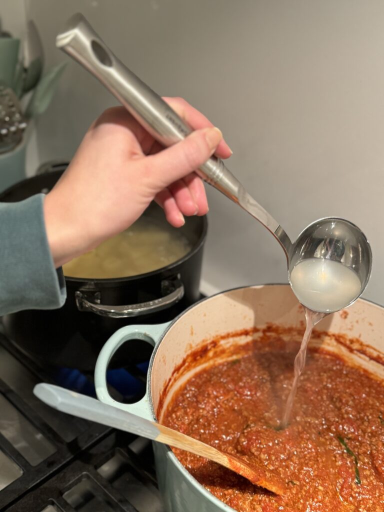 - Ladle the cooked pasta into the sauce along with a little pasta water.