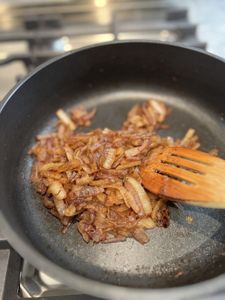 - Once the beef broth has evaporated, set it aside until the onions have cooled down completely.