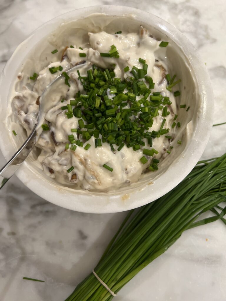 - Once your onions are completely cool, add them to the bowl with the Greek yogurt, sour cream, and fresh chopped chives.